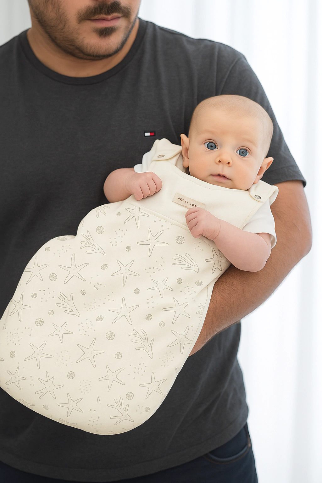 Introducirlo dentro de su bolsa de dormir, cerrando cierres y broches. Podés regular el tamaño gracias a los broches de la sisa, la bolsa crece con tu bebé